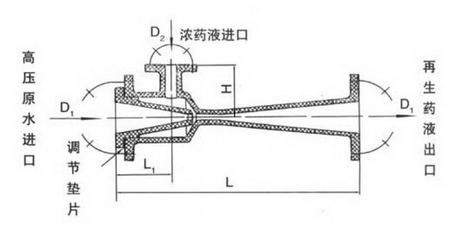 高壓原水通過(guò)管道閥門(mén)]進(jìn)入噴射器的漸縮段,將靜壓頭轉(zhuǎn)換成動(dòng)能,在噴嘴處成為高速射流,使混合室形成微真空狀態(tài)將高濃度的再生液吸入混合室,并使再生藥液的壓力和速度發(fā)生變化;在混合段內(nèi),水和藥液得到充分地混合,然后注經(jīng)擴(kuò)散段,使再生液減低流速,靜壓頭升高,再通過(guò)出口管道及閥門(mén)將稀再生液送到交換器本體中。