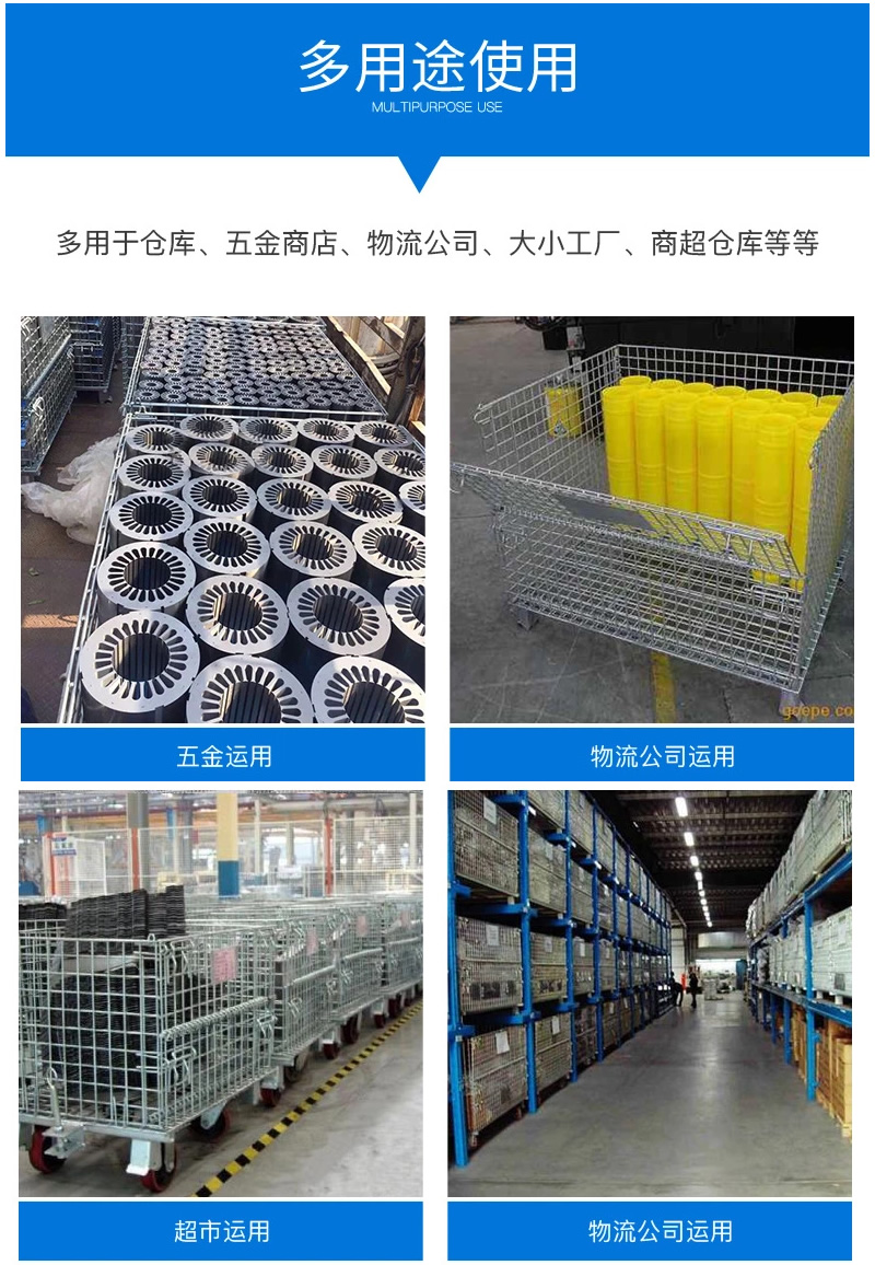 倉庫籠是物流集裝單元周轉(zhuǎn)中的常用產(chǎn)品。廣泛應(yīng)用于立體倉庫,生產(chǎn)車間,物流配送中心等等。使用倉庫籠存放貨物規(guī)格統(tǒng)一,容量固定,存放一目了然,易于清點(diǎn)。倉庫籠也叫倉儲(chǔ)籠、蝴蝶籠、蝴蝶欄,是倉儲(chǔ)運(yùn)輸中不可缺少的設(shè)備。 可使用各種搬運(yùn)設(shè)備進(jìn)行搬運(yùn),自身可堆垛四層,實(shí)現(xiàn)立體化存儲(chǔ);空籠存放時(shí)折疊存放,節(jié)省空間。使用簡便,表面鍍鋅處理,抗工廠和室外環(huán)境腐蝕,使用壽命長。使用強(qiáng)力鋼條碰焊而成,底部以U型槽鋼焊接補(bǔ)強(qiáng),使結(jié)構(gòu)更堅(jiān)固。配合搬運(yùn)設(shè)備,廣泛用于運(yùn)輸、搬運(yùn)、裝卸、存儲(chǔ)等各個(gè)物流環(huán)節(jié)中,降低成本,提高效率。 在倉庫籠內(nèi)配上萬通板或者紙板,可有效保護(hù)容易劃傷表面的物品。規(guī)格統(tǒng)一,容量固定,存放一目了然,易于倉庫的清點(diǎn)。