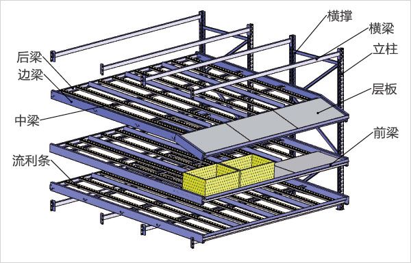 流利式貨架結(jié)構(gòu)特點(diǎn):流利式貨架的流利條直接連接到前后橫梁及中間支撐梁上,橫梁直接掛在支柱上,流利條安裝傾斜度取決于貨箱的尺寸、重量以及流利架的深度,通常取5%~9%。流利條滾輪的承載力為6kg/只,當(dāng)貨物較重時,可以在一個滾道安裝3-4根流利條。通常在深度方向上每隔0.6m安裝一根支撐梁以增加流利條的剛度。當(dāng)滾道較長時,可用分隔板將滾道隔開。取貨端需安裝制動片使貨物減速,降低沖擊。